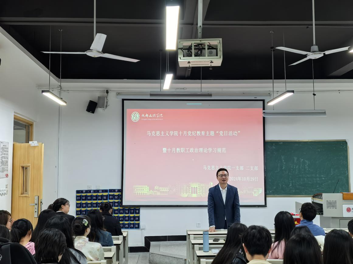 2024年10月29日下午,马克思主义学院一支部、二支部全体党员在主教楼D401按照学校党委要求开展十月主题党日活动暨10月教职工政治理论学习会议。会议由党总支书记古威主持。