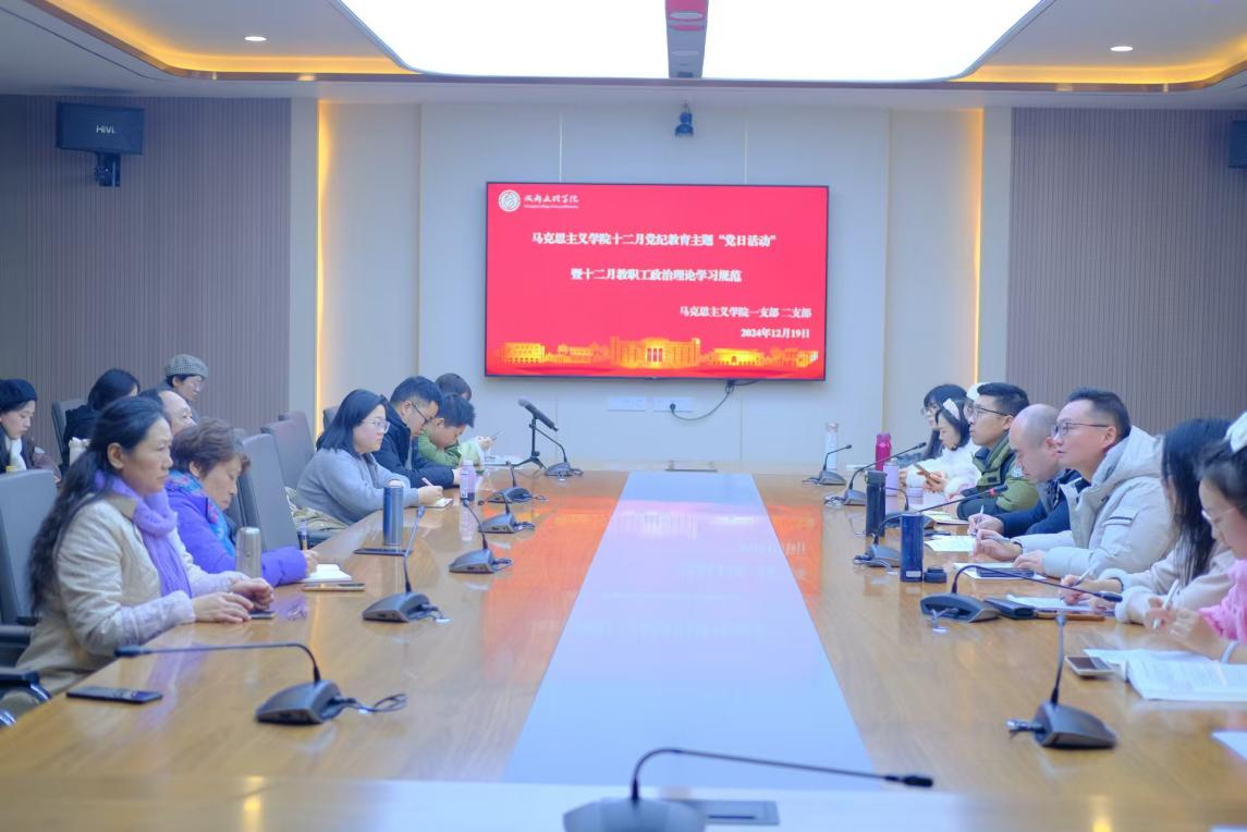 2024年12月18日下午,马克思主义学院一支部、二支部全体党员在第二会议室按照学校党委要求开展十二月主题党日活动暨教职工政治理论学习会议。会议由党总支书记古威主持。