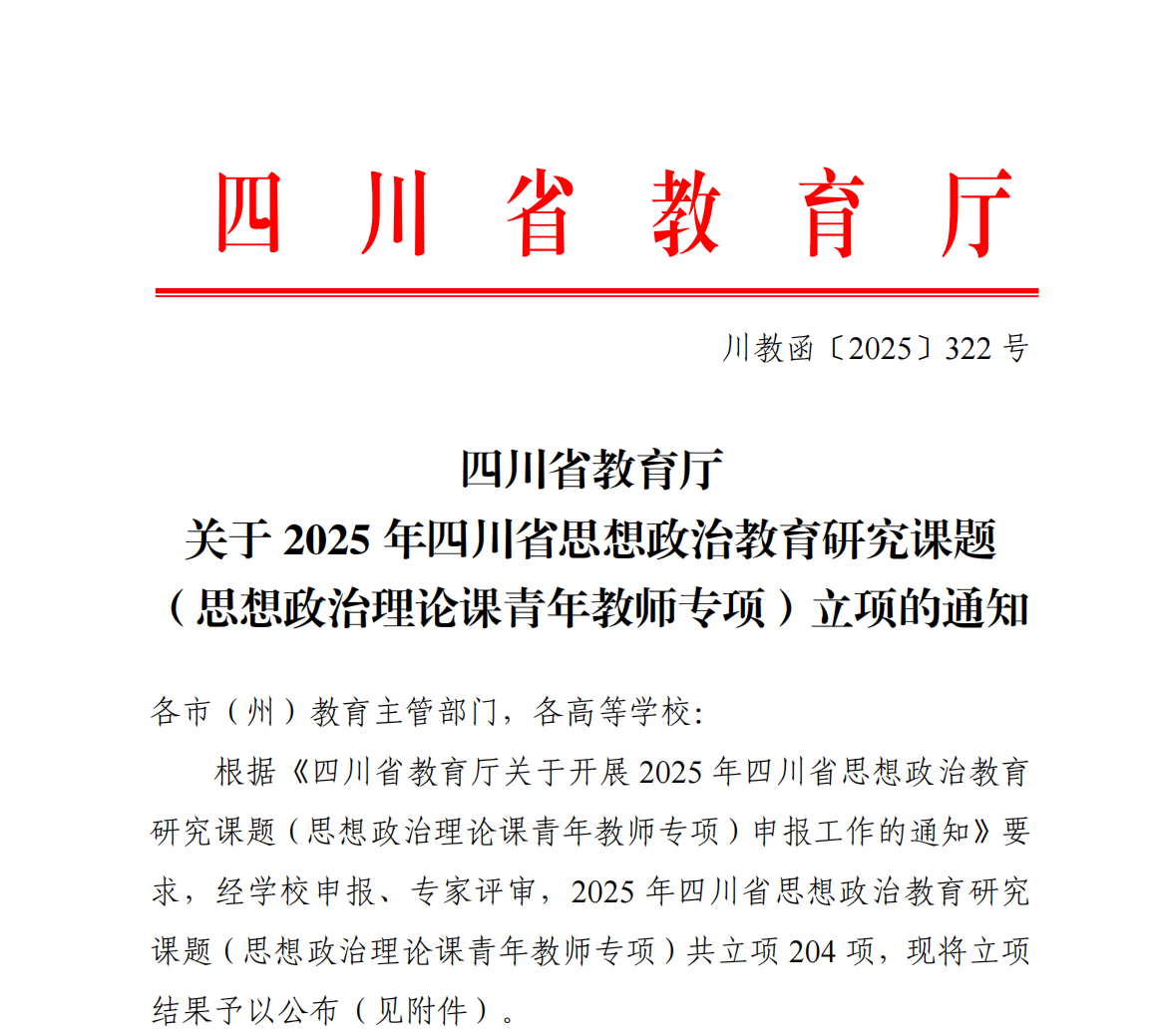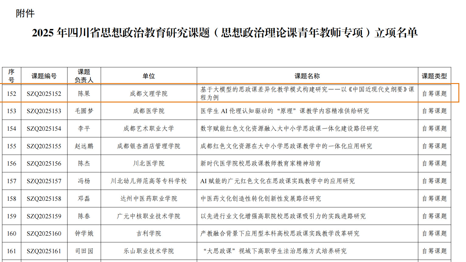 11月18日,四川省教育厅正式公布了2025年四川省思想政治教育研究课题(思想政治理论课青年教师专项)立项名单。我院陈果老师申报的课题《基于大模型的思政课差异化教学模式构建研究——以《中国近现代史纲要》课程为例》经过激烈角逐,成功获得立项。这一成果标志着学院在青年教师培养和科研创新方面取得了又一重要进展。