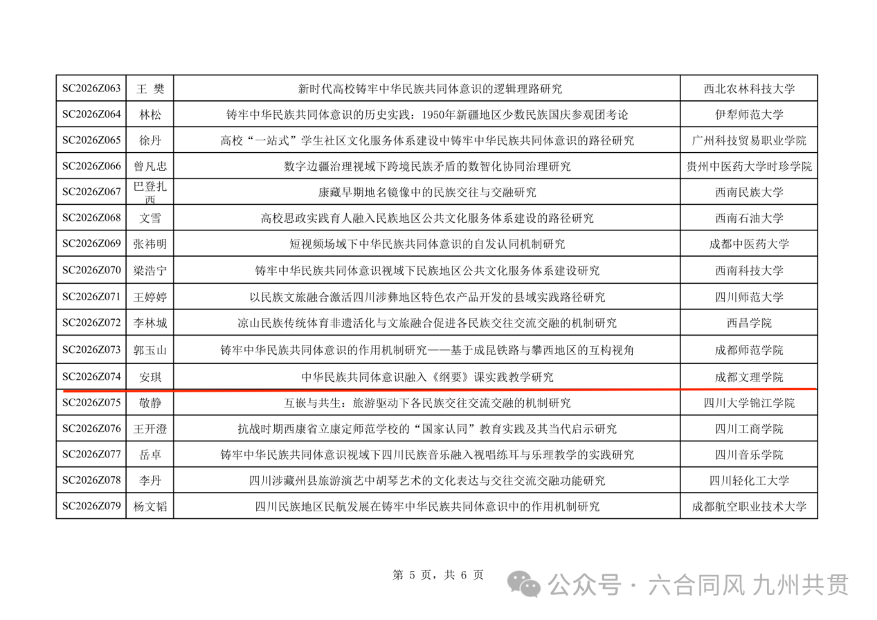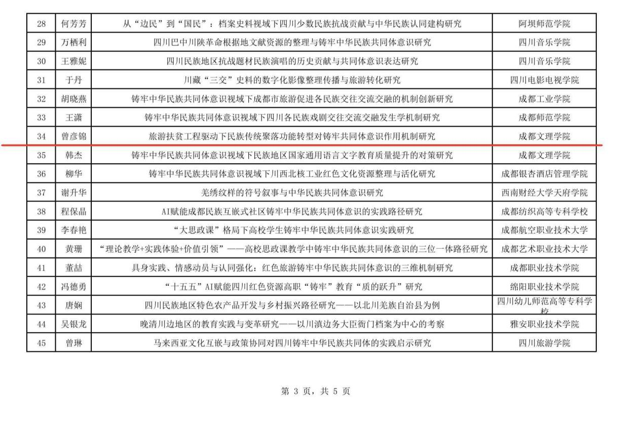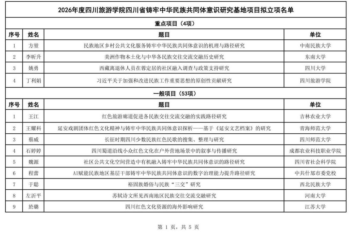 近日,《2026年度四川旅游学院“四川省铸牢中华民族共同体意识研究基地”项目立项名单》公布,经积极组织、认真准备,我院教师曾彦锦主持申报的《旅游扶贫工程驱动下民族传统聚落功能转型对铸牢共同体意识作用机制研究》、教师安琪主持申报的《中华民族共同体意识融入<纲要>课实践教学研究》项目成功获批。