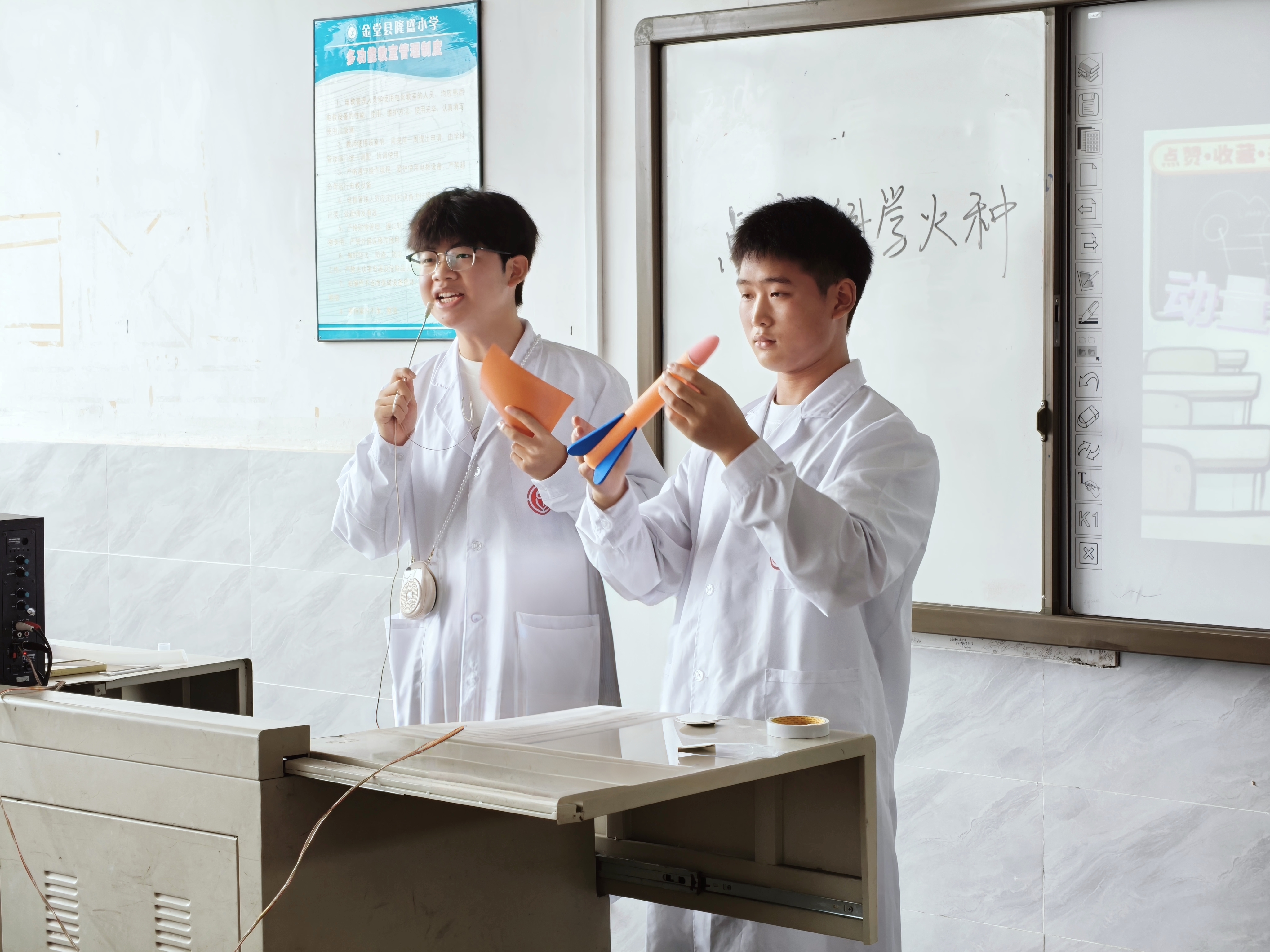 实验展示环节中,小型等离子炮、水火箭酒精发动机等趣味实验吸引了全场目光。志愿者们通过通俗的语言和直观的操作,深入浅出地讲解了牛顿第三定律、动量守恒定律等物理原理,让同学们直观感受航天科技的魅力。随后,在志愿者们的指导下,同学们分组合作制作气压小火箭,亲手体验“发射”乐趣,现场气氛热烈。