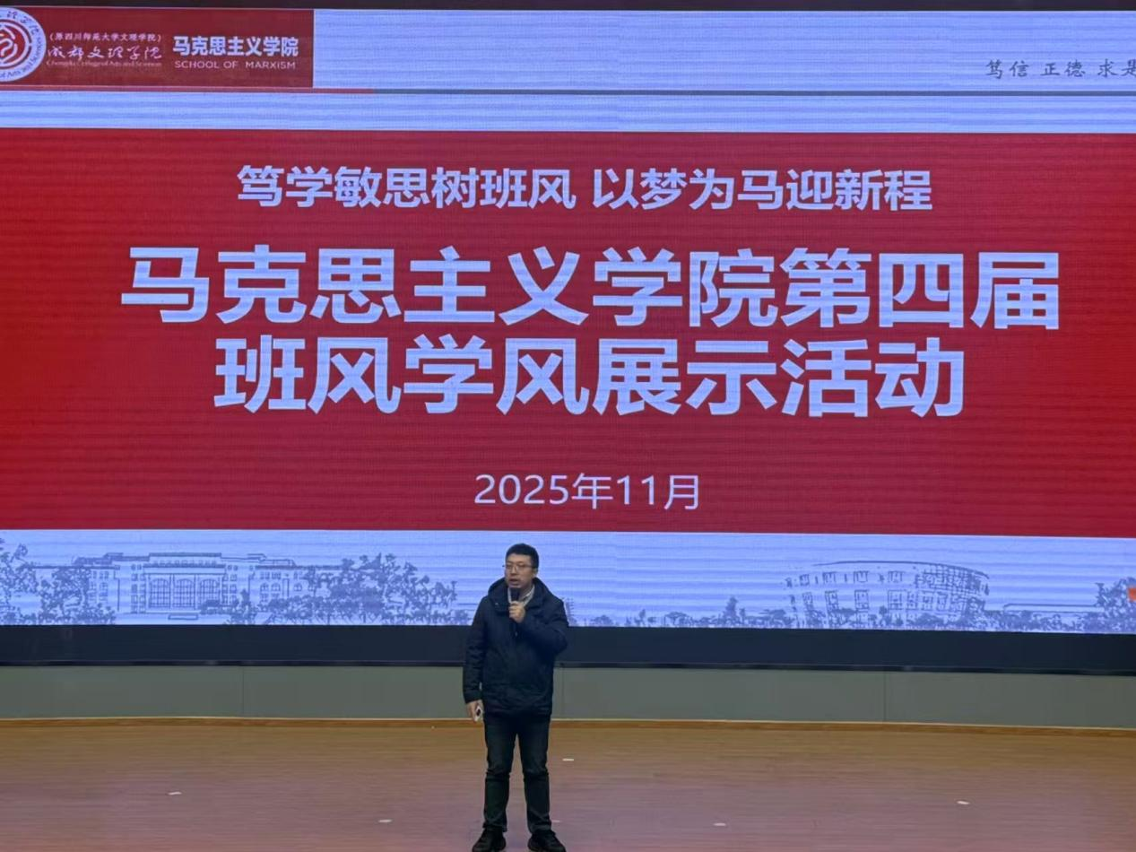 袁久斌点评。他首先对同学们的表现表示肯定,也对本次活动中存在的问题提出改进意见。他表示,本次活动旨在弘扬优良班风学风,形成积极向上的班级氛围并展现良好的精神风貌。他对同学们提出三点期望:一是希望各班级以班风学风建设为契机,打造兼具理论深度和青春特色的集体文化符号;二是以班风学风为桥,凝聚奋进力量,共同营造“敢创新、善思考、有温度”的学习氛围。三是深入贯彻习近平总书记对青年学子的要求,以笃学敏思的态度,在实践探索中锤炼过硬本领。