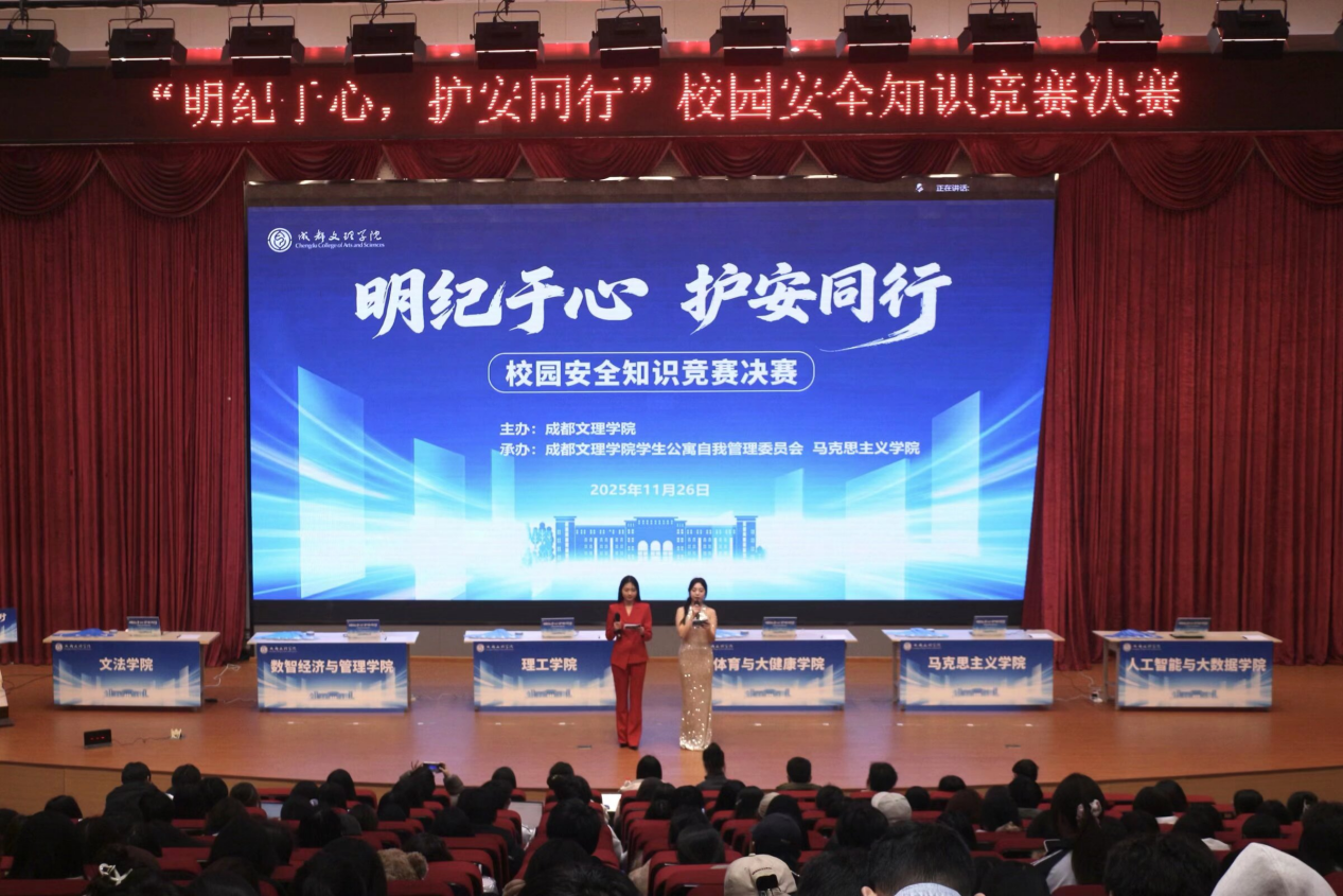 为深入贯彻落实校园安全管理条例,强化学生纪律意识和安全责任观念,11月26日,我校在文理讲堂成功举办以“明纪于心,护安同行”为主题的校园安全知识竞赛。我院党总支副书记兼学工办主任袁久斌、理工学院直属党支部副书记学工办主任高长悦、体育与大健康学院学工办主任周晓丹及各学院自管委指导老师参加了活动。陈碧月和赵佳瑞主持比赛。