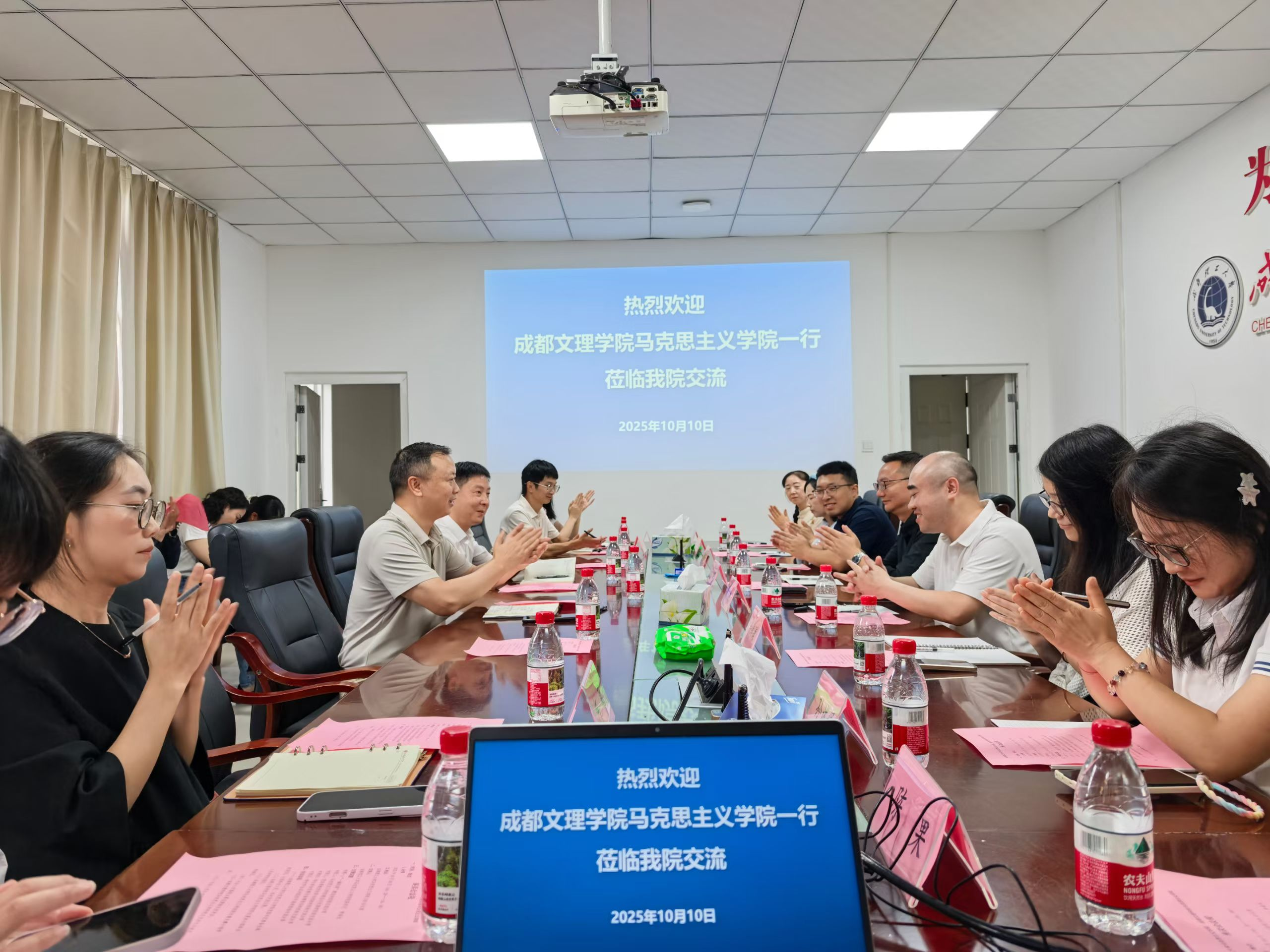 10月10日,我院前往成都理工大学马克思主义学院开展交流共建活动。成都理工大学马克思主义学院党委书记李奋生,院长曾文麒,党委副书记、纪委书记周菲,副院长赵如以及各教研部主任,青年教师代表参加。我院院长夏冰,党总支书记古威,党总支副书记袁久斌,各教研室主任和青年教师代表参加座谈会。会议由李奋生主持。