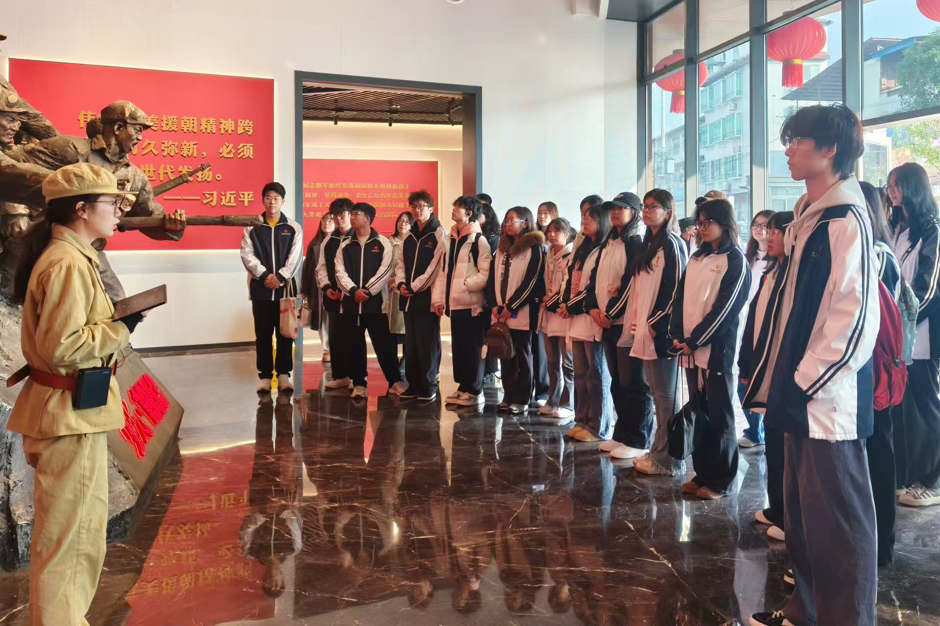 11月23日上午,师生共同前往金堂县星光·1953 红色教育基地。同学们沿着红色文化长廊开启了“全景式参观之旅”。他们认真聆听金堂籍志愿军战士胡修道在抗美援朝战场上的英勇事迹,那一段段惊心动魄的战斗故事仿佛将大家带回到了那个战火纷飞的年代;仔细端详展馆内珍贵的嘉奖令、军号等展品,深入挖掘这些文物背后所蕴含的深远历史价值与伟大精神密码。通过参观,同学们真切地感受到了抗美援朝战争的残酷与伟大,深刻领悟到革命先辈们为了保家卫国、不畏强敌的崇高气节和伟大精神。