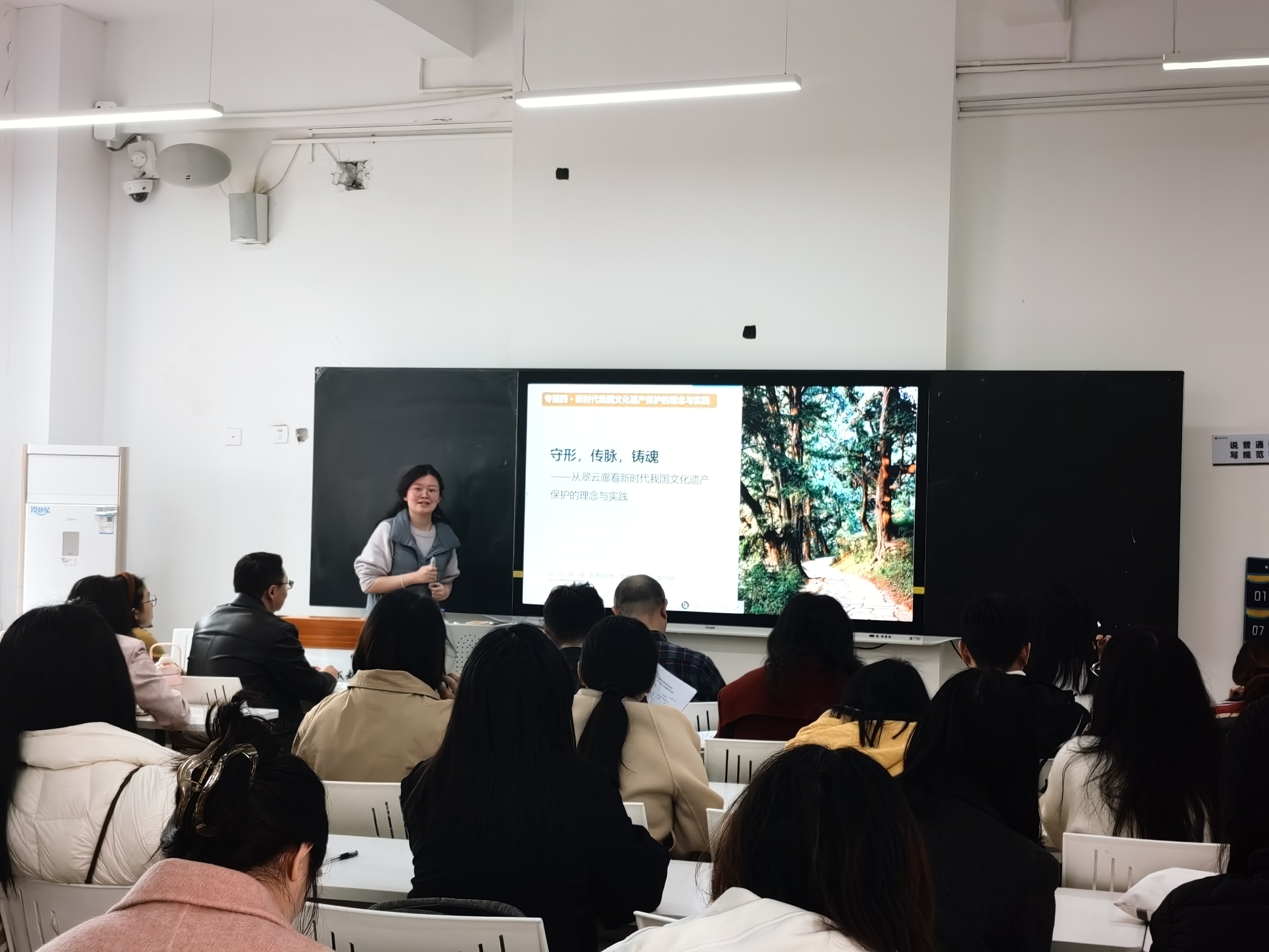 本次公开课由祁彦含教师进行《形势与政策》课程主讲,授课题目为《守形,传脉,铸魂——从翠云廊看新时代我国文化遗产保护的理念与实践》。祁彦含围绕新时代我国文化遗产保护的理念与实践展开讲授,以翠云廊这一具有深厚历史文化底蕴的文化遗产为切入点,结合课程主题,从文化遗产保护的理念与措施进行了系统阐释。