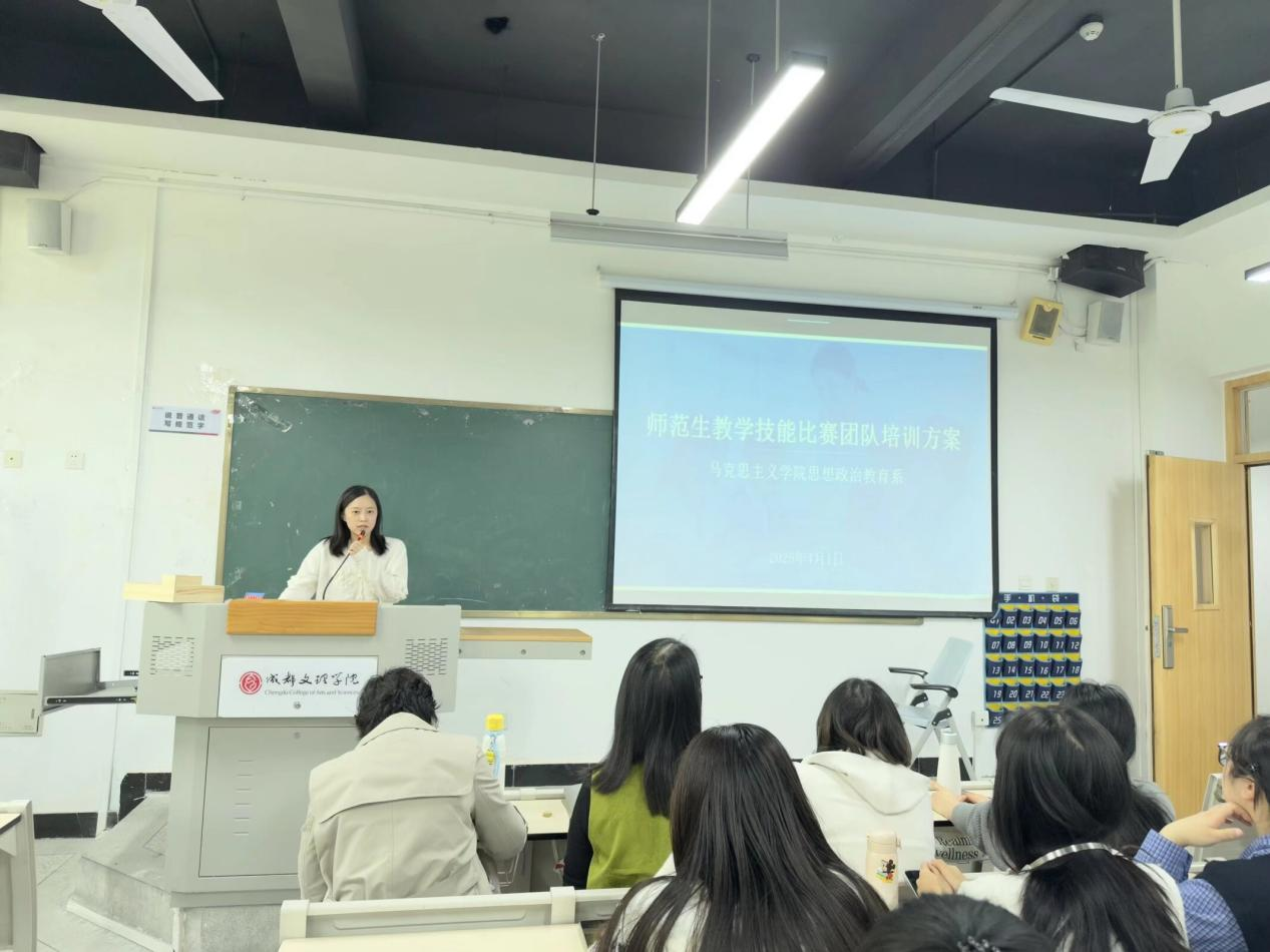 随后,贺雨诗就本次师范生教学技能比赛团队培训方案进行了详细解读。方案围绕“深化学科教学特色、提升教学实操水平、夯实教学核心技能、激发教学创新活力、积累教学竞赛经验”五大目标,通过优化互动环节、创新教学形式、强化团队协作,着力打破个人教学的局限,来全面提升师范生的教学实践能力。
